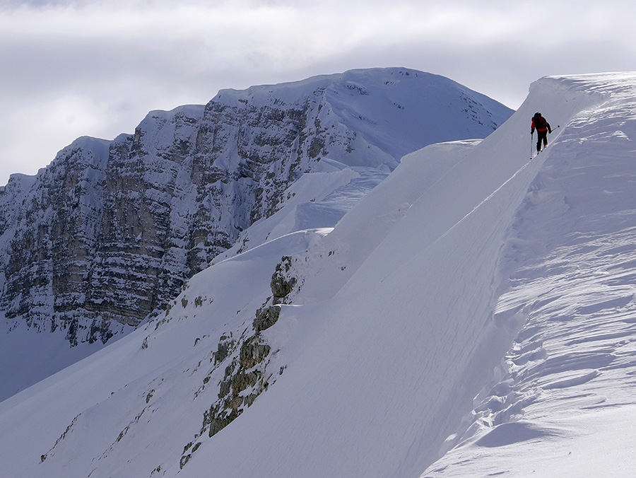 Traversata del Velino: dal Valico del Puzzillo, Max Marconi scende su una spina di neve con alle spalle la parete del Costone